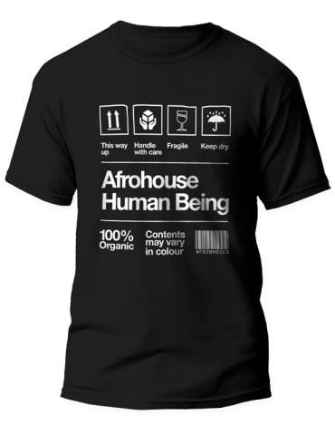 Black cotton T-shirt with ‘Afrohouse Human Being’ print in white, screen printed